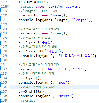 | unshift(new data) | 배열 객체의 가장 앞의 인덱스에 새 데이터를 삽입 |