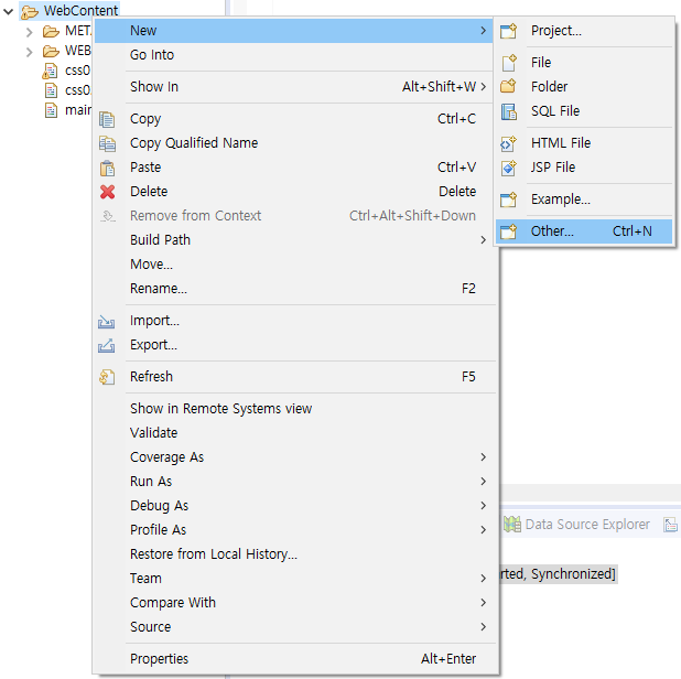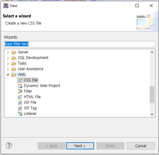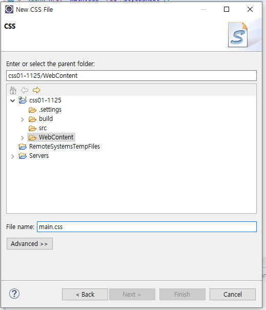 WebContent 오른쪽마우스클릭 -> New -> Other -> Web -> CSS File ->main.css 생성