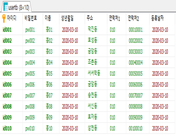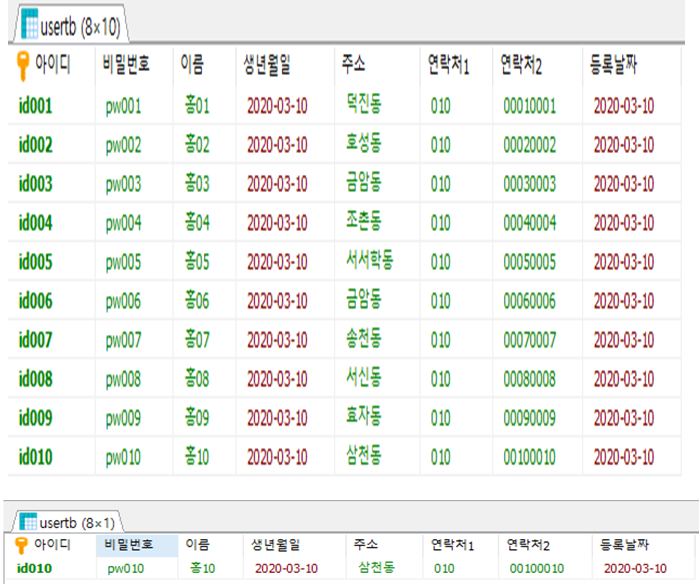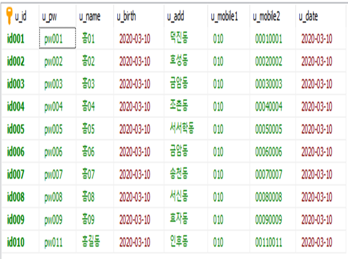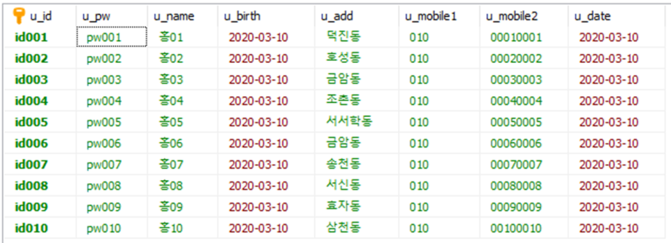 VALUES('id010','pw010','홍10','2020-10-10','덕진동','010','00010001','2020-03-10');