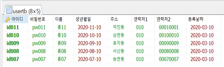 VALUES('id011','pw011','홍11','2020-11-10','덕진동','010','00010001','2020-03-10');