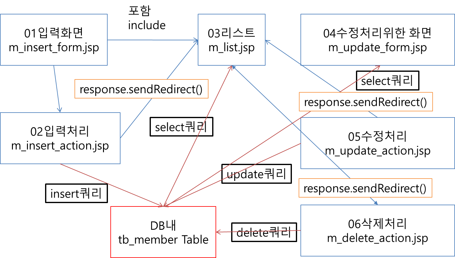 회원가입, 수정, 삭제 후 리스트 화면으로 돌아가도록 코드를 추가한다.