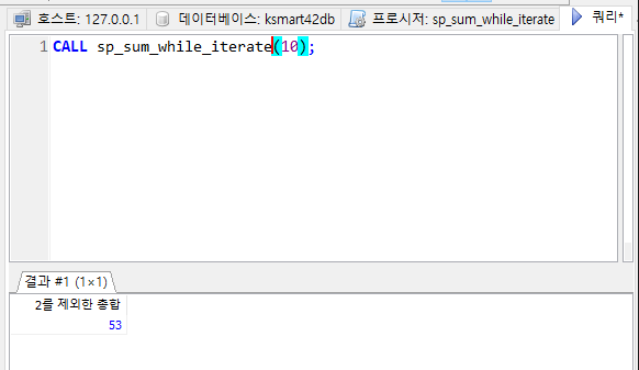 입력한 수 범위 중 2를 제외한 총합을 구하는 프로시저