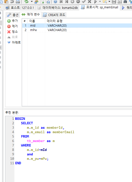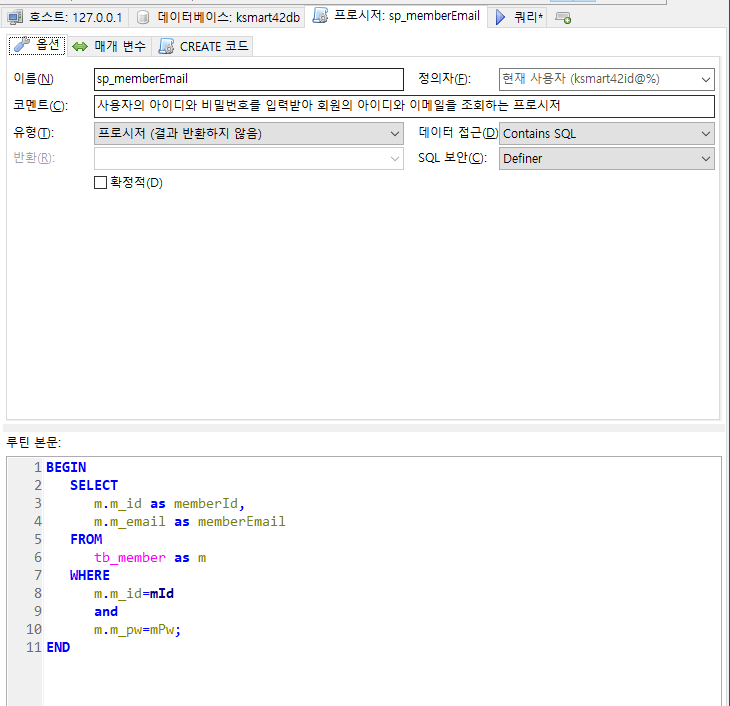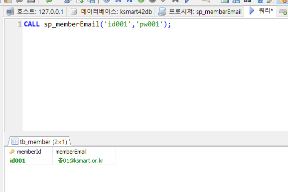 회원테이블의 아이디와 패스워드를 입력받아 일치하는 이메일을 출력하는 프로시저