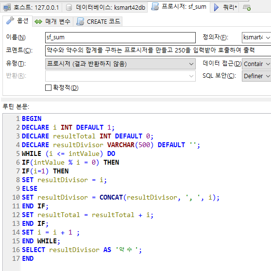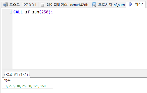 약수와 약수의 합계를 구하는 프로시저를 만들고 250을 입력받아 호출하여 출력