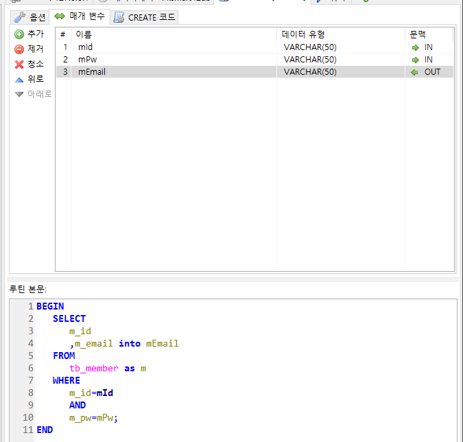 사용자의 아이디와 비밀번호를 입력받아 사용자의 아이디와 이메일을 조회하고 이메일 out 파라미터에 담는 프로시저