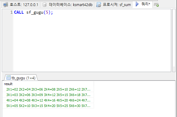 다음과 같이 숫자를 입력받아 구구단의 결과를 tb_gugu에 삽입하는 프로시저를 정의하고 호출하시오.