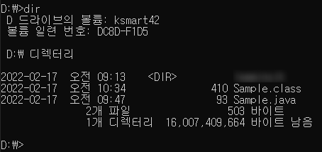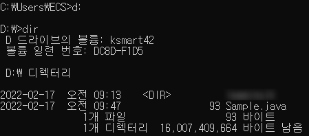 dir을 입력하면 D 드라이브에 있는 파일을 확인할 수 있다.