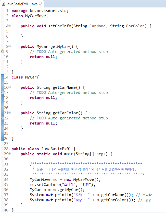 * 실습. 아래의 구현체를 보고 각 클래스와 메서드를 선언하도록 하여라.