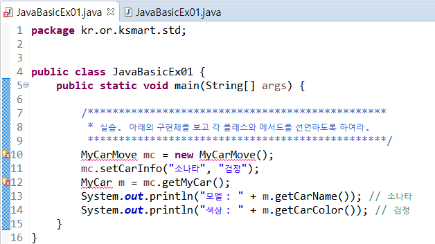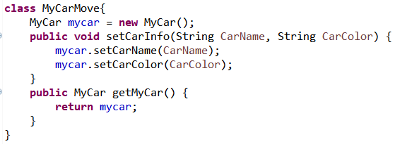 MyCar의 CarName과 CarColor 지역변수를 MyCarMove 클래스 내 setCarInfo 매개변수로 세팅한다.