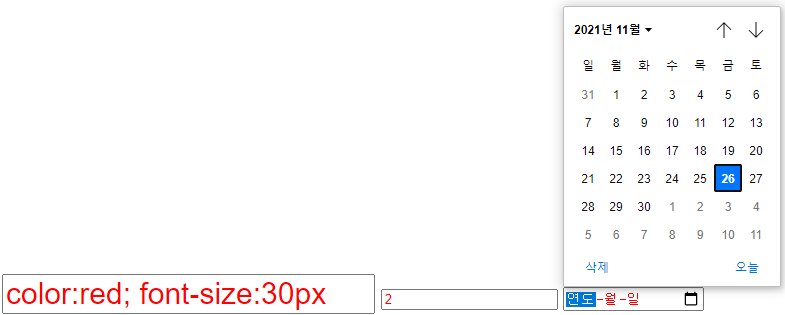 - 예 ) input { color : blue; } -> 모든 input 태그에 텍스트요소 color blue 로 적용