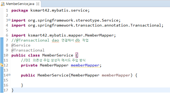 Service에 DI 의존성 주입을 생성자 메서드 주입방식으로 한다.
