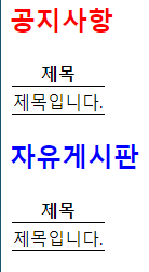 각 공지사항의 타이틀은 빨강색상, 자유게시판 타이틀은 파랑색상,