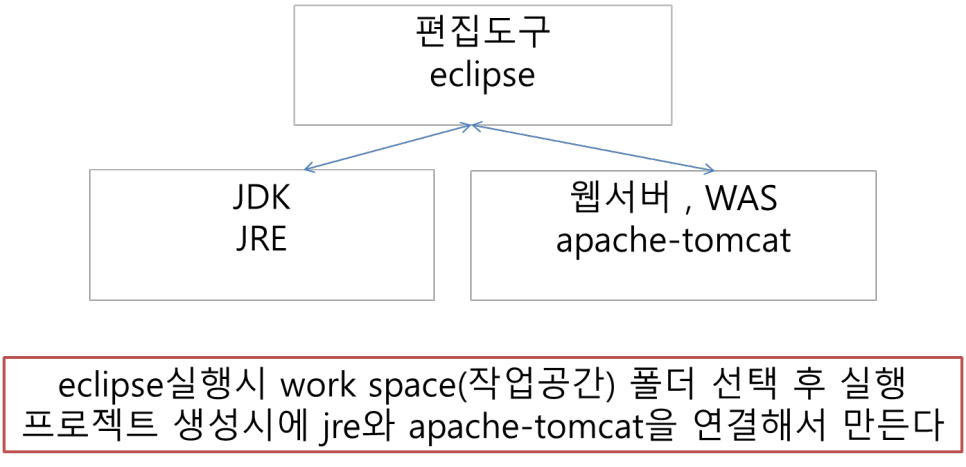 프로젝트 생성시에 jre와 apache-tomcat을 연결해서 만든다.
