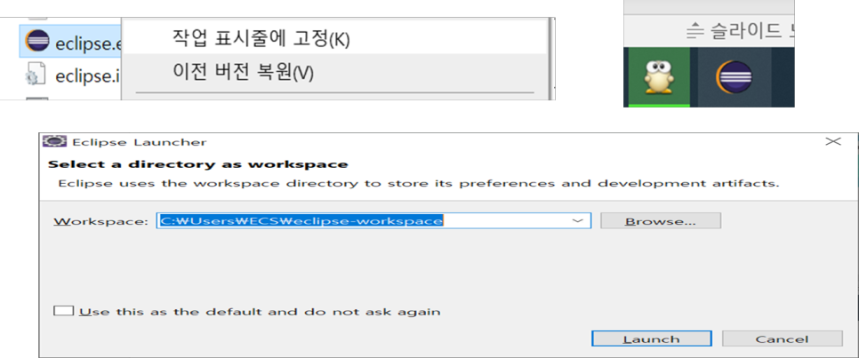 eclips 실행 시 work space(작업공간) 폴더 선택 후 실행