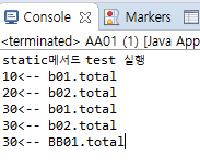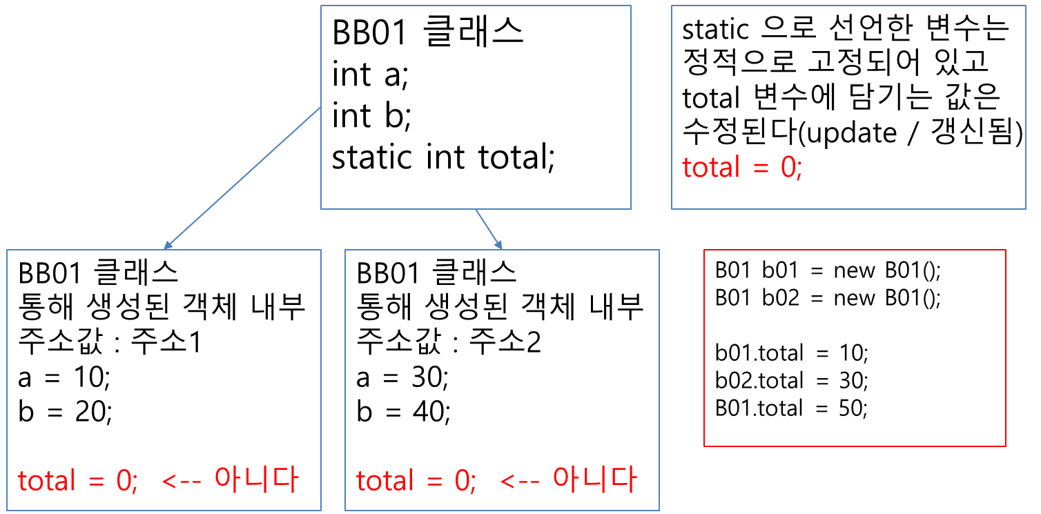 클래스명.변수에 값을 세팅 가능하고 객체참조변수 b01.total =10 으로 값을 입력하면 모든 total 값이 10으로 변경된다.
