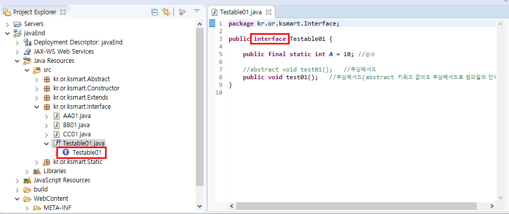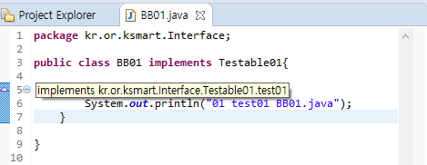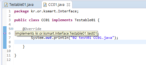 - Testable01 interface로부터구현을 명령받은 cc01 클래스에서는 Testable01 interface 내에 있는 test01 추상 메서드를 구현해야 한다.