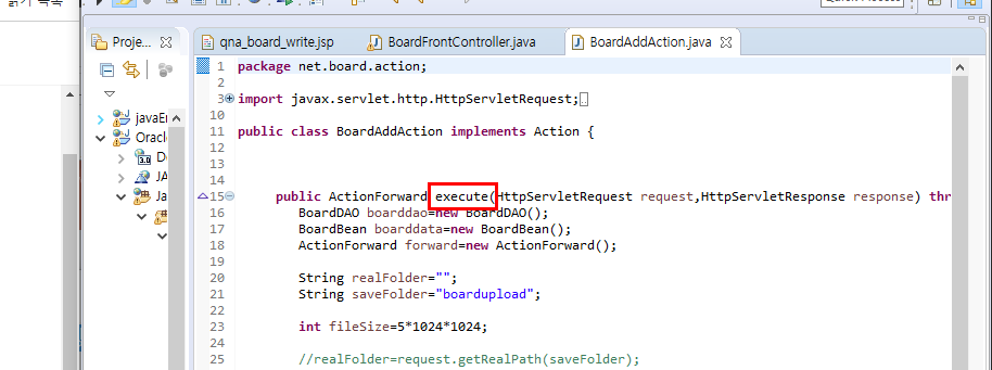 Action interface로부터 구현을 명령받은 BoardAddAction 에서execute 추상 메서드를 반드시 구현해야한다.