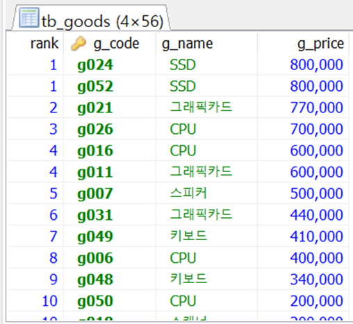 WHEN @gprice := g.g_price THEN @rank := @rank +1