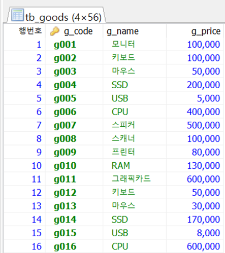1부터 시작하는 행의 번호를 포함하여 상품테이블을 출력하시오.