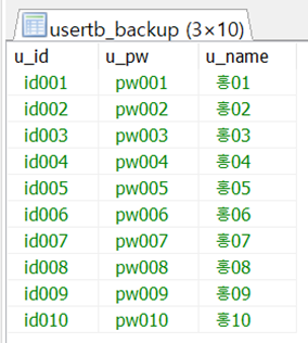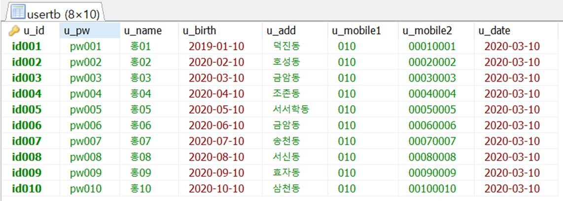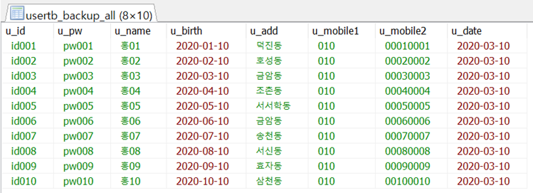 INSERT INTO tb_user(u_id, u_pw, u_name, u_birth, u_add, u_mobile1, u_mobile2, u_date)