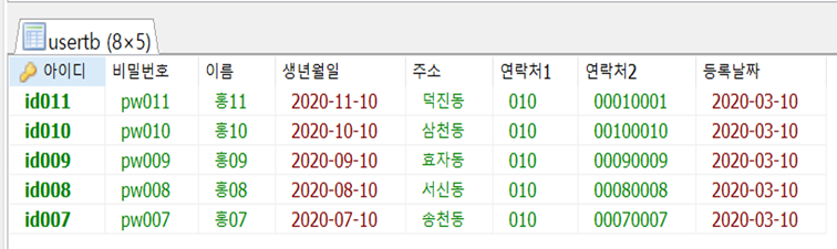 ('id001', 'pw001', '홍01', '2020-01-10', '덕진동', '010', '00010001', '2020-03-10')